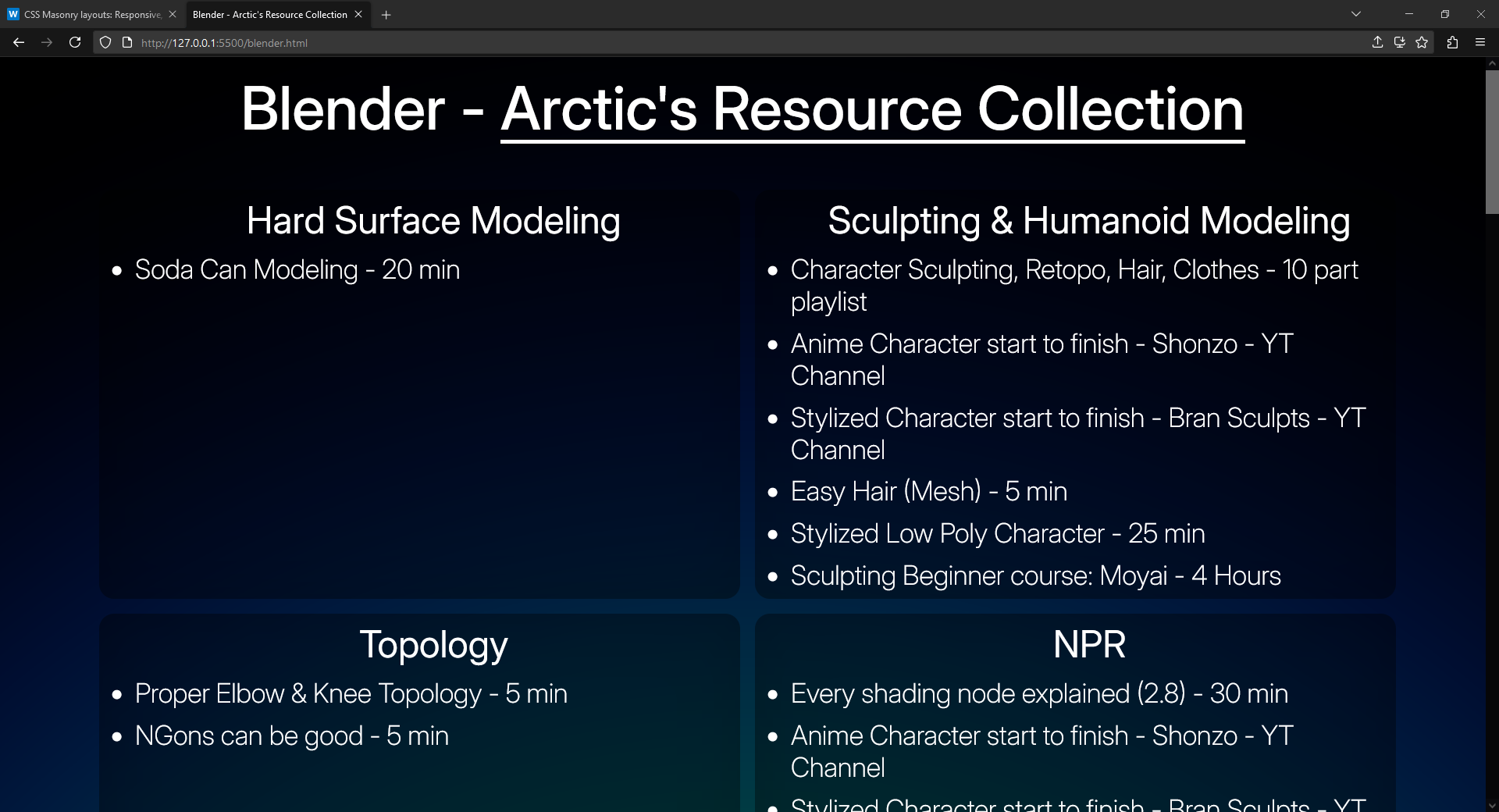 - Added html for masonry in “color” and “coding” sections but only had time to put 1 link in “color”